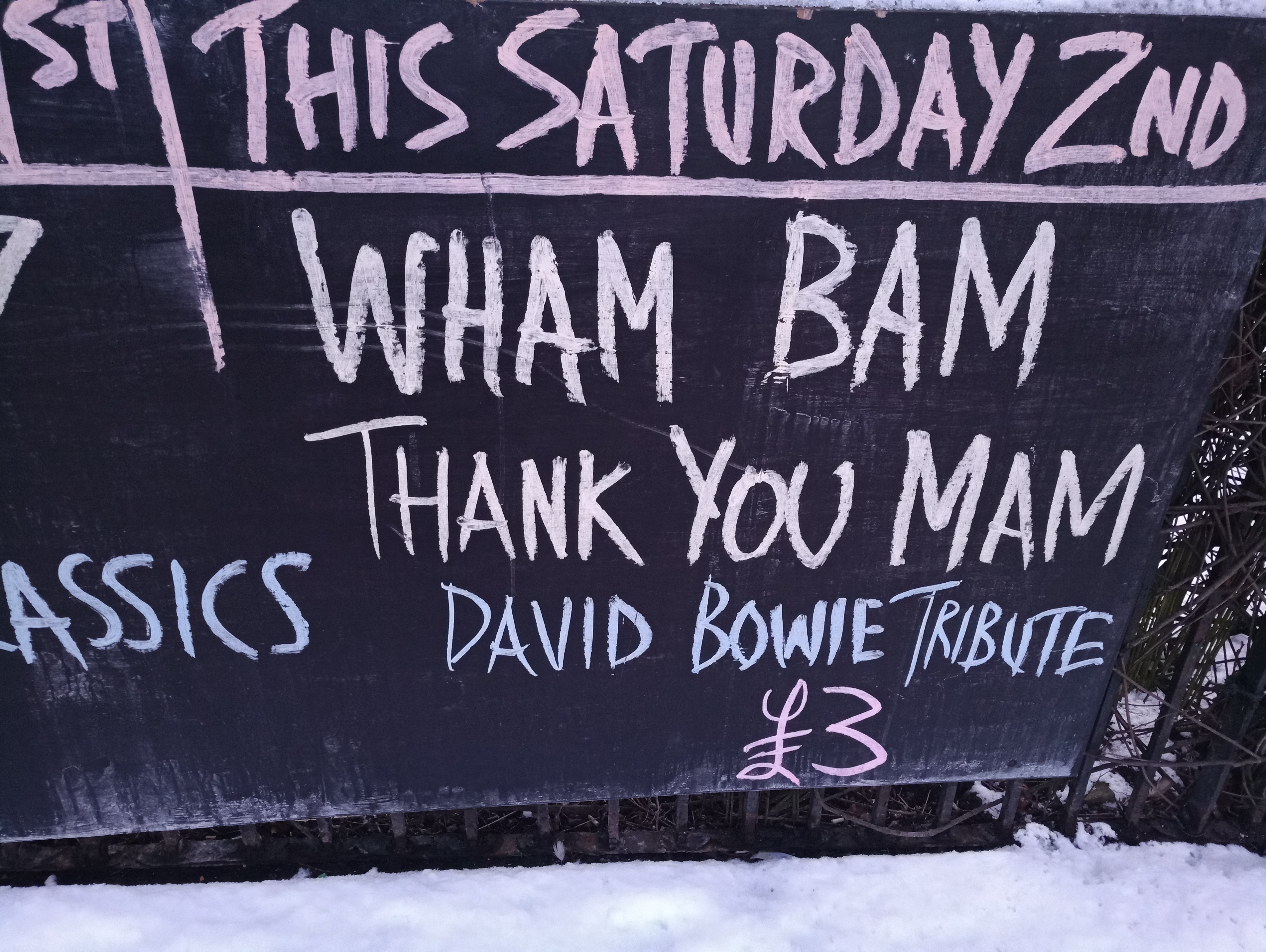 Tonight, Saturday 2nd, we have a great David Bowie tribute and, Wham Bam Thank You Mam. Well worth coming along to hear them play.